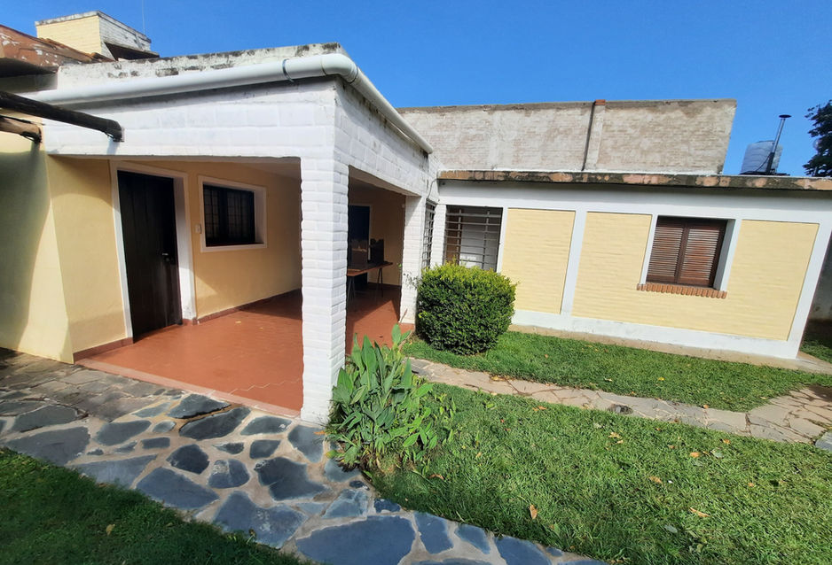 Gran parque con cochera, asador y cuarto de herramientas, con acceso por calles 25 de Mayo (frente) y Los Aromos (fondo).